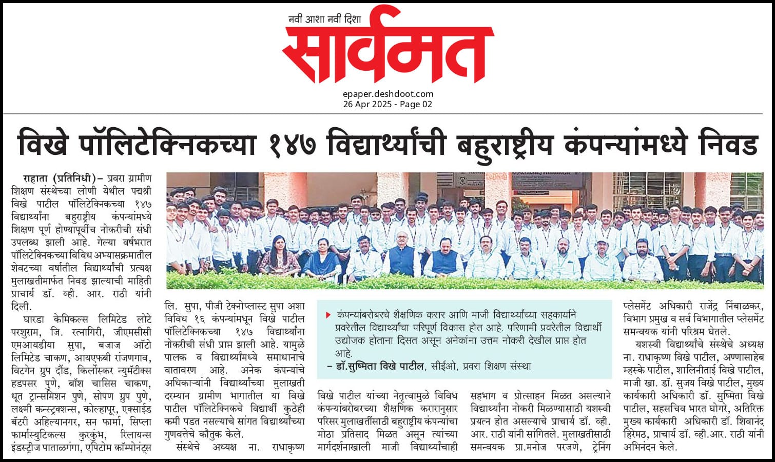 विखे पाटील पॉलिटेक्निकच्या 177 विद्यार्थ्यांची बहुराष्ट्रीय कंपन्यांमध्ये निवड |