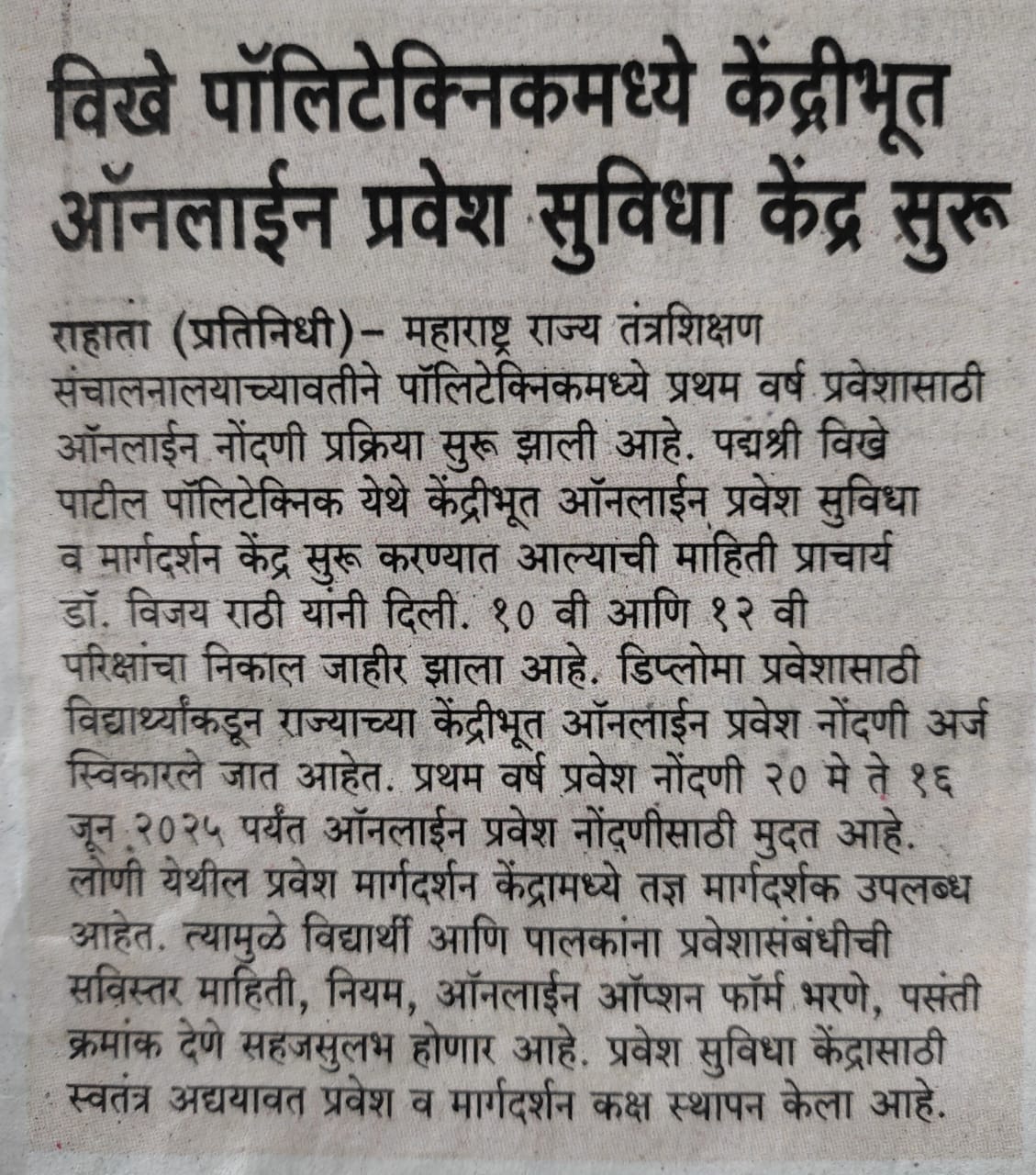 विखे तंत्रनिकेतन मध्ये केंद्रीभूत ऑनलाईन प्रवेश प्रक्रिया २०२५ सुरु