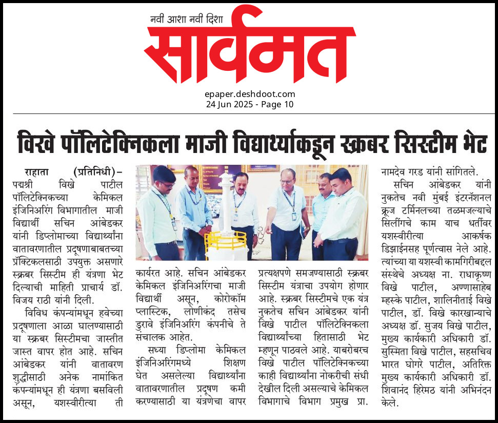 विखे तंत्रनिकेतन ला माजी विद्यार्थ्याकडून स्क्रबर सिस्टम भेट