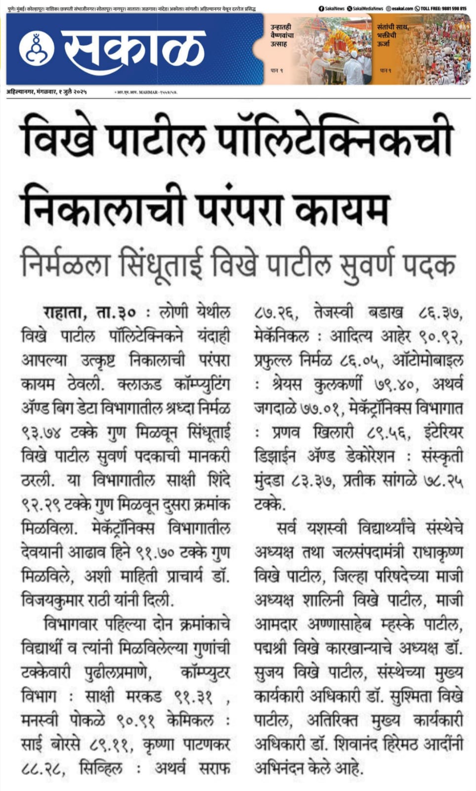 विखे पाटील पॉलिटेक्निक ची उत्कृष्ट निकालाची परंपरा कायम. सुशांत गाडे 93.21 टक्के गुण मिळवून सिंधुताई विखे पाटील सुवर्णपदकाचा मानकरी ठरला