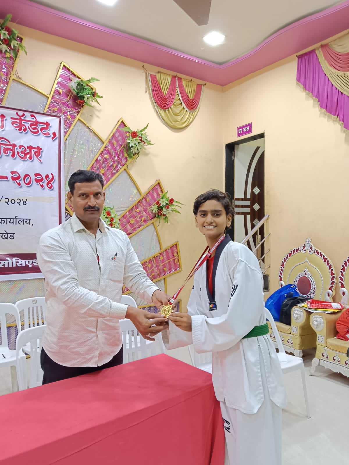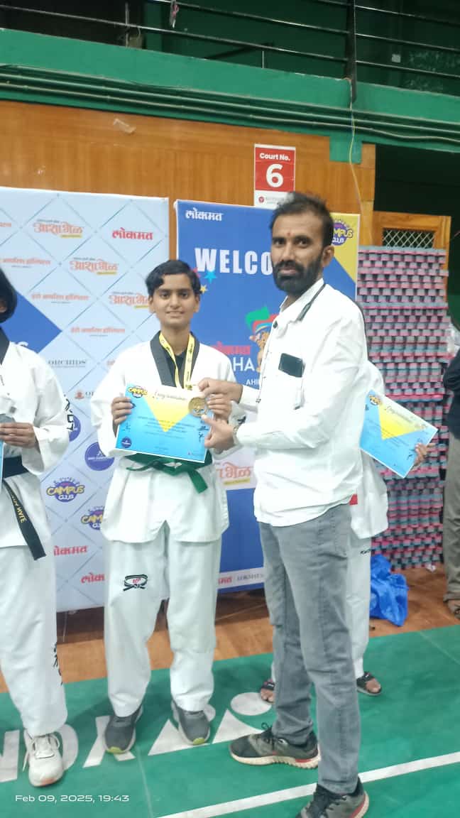 Miss. Saisha Rahul Bendre won Gold Medal at District Level Lokmat Maha Games Taekwondo Competition held at Wadia Park Ahilyanagar