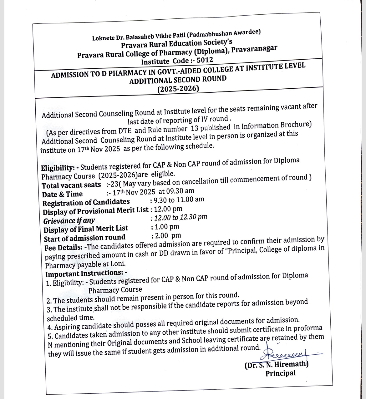 Pravara Rural College of Pharmacy (Diploma), Loni was set up in 1981 as one of the 7 disciplines in Dr. Vitthalrao Vikhe Patil Institute of Technology & Engineering (Polytechnic), Pravaranagar. In 1991, the Diploma Pharmacy college became an independent institute.