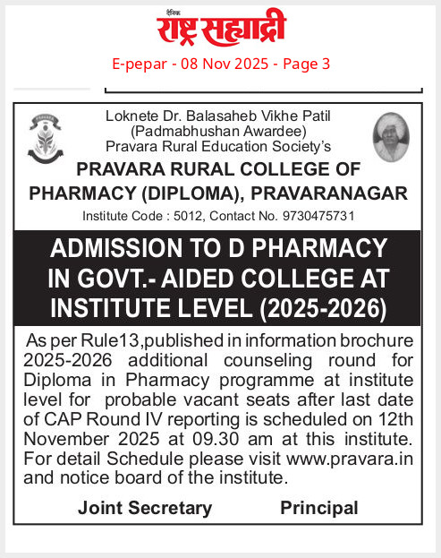 All admissions are done through centralized admission process (CAP), by Director of Technical Education (DTE), Mumbai. Notification for admission to Diploma in Pharmacy is published in the month of June/July of every year on DTE website- www.dtemaharashtra.gov.in